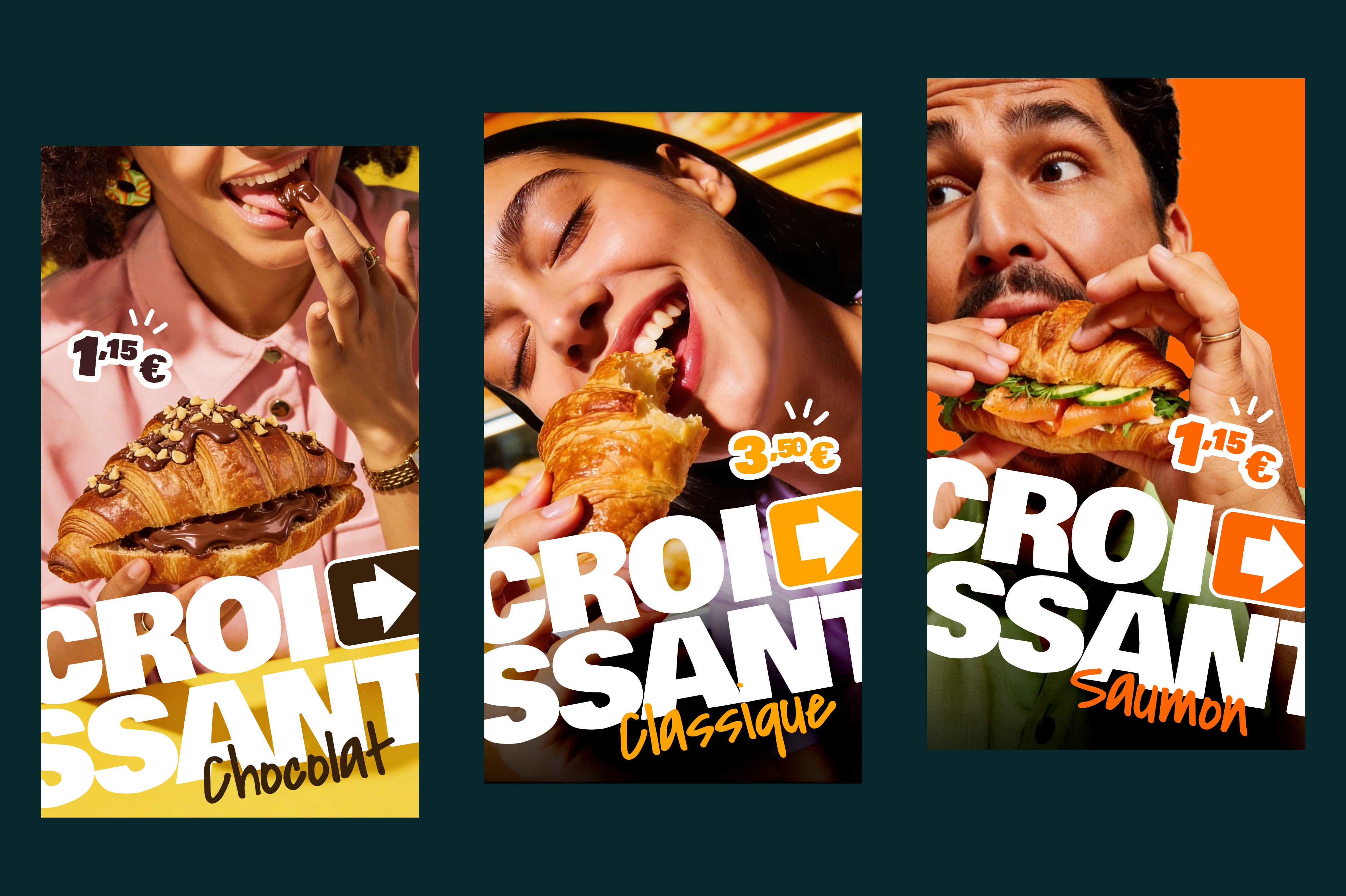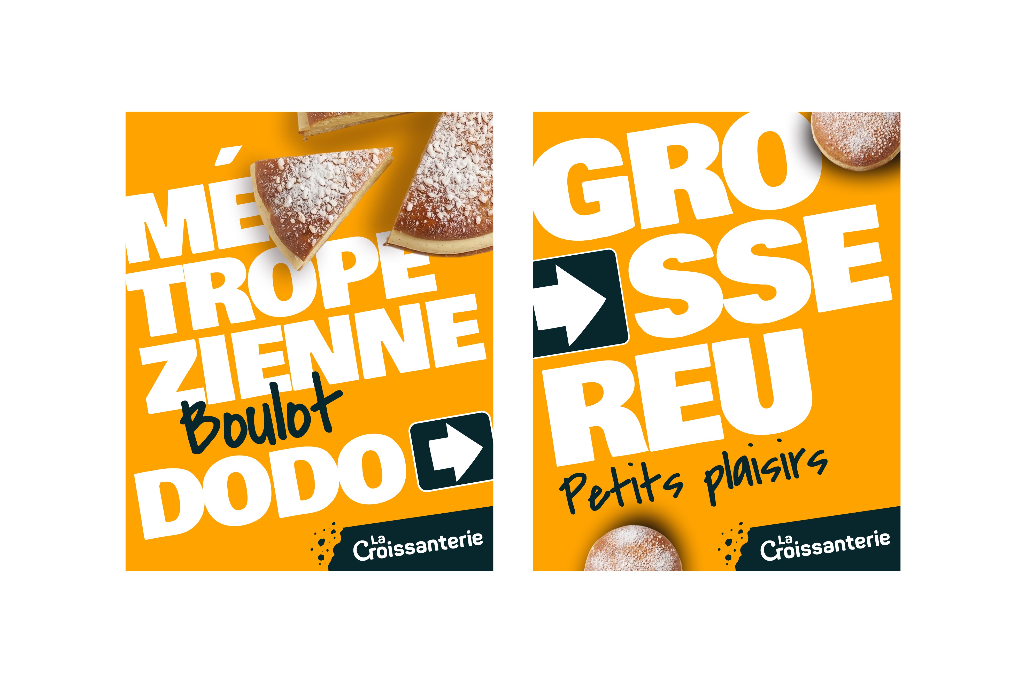 La direction artistique s'est construite autour d'une idée simple : La Croissanterie c'est ce qui lance un moment. Une journée, un voyage, une réunion. La flèche est venue naturellement comme un starter, un signal de départ. Elle donne à la marque une énergie directionnelle, presque cinétique.